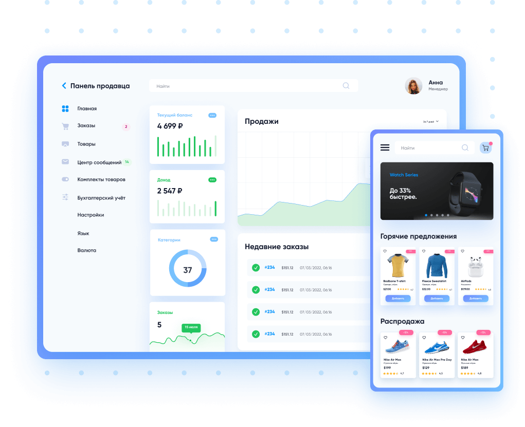 Простая в использовании панель администратора — одна из причин, почему клиенты выбирают нашу платформу для маркетплейса для своих проектов. Возможность самостоятельного управления маркетплейсом позволяет чувствовать себя вовлеченным в процесс работы маркетплейса и более рационально расходовать бюджет.