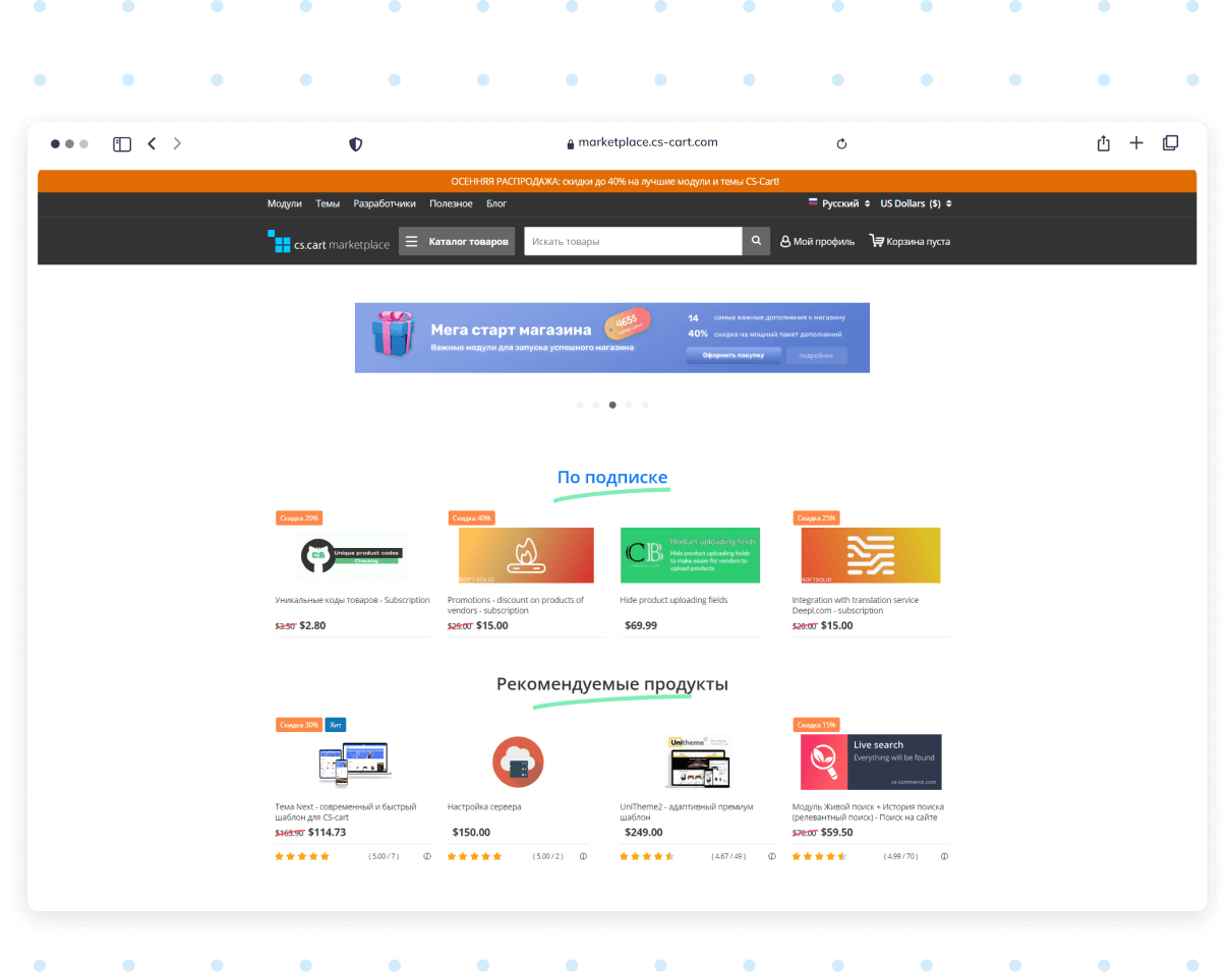 Приобретая лицензию CS-Cart для маркетплейсов, вы становитесь частью большого сообщества. На нашем форуме всегда можно задать вопрос «как создать маркетплейс» и получить советы от пользователей: как настроить функциональность, продвигать маркетплейс, привлекать продавцов на сайт и развивать проект. На форуме вы даже можете найти советы по разработке модулей и поиску готовых модулей оплаты и доставки заказов.
